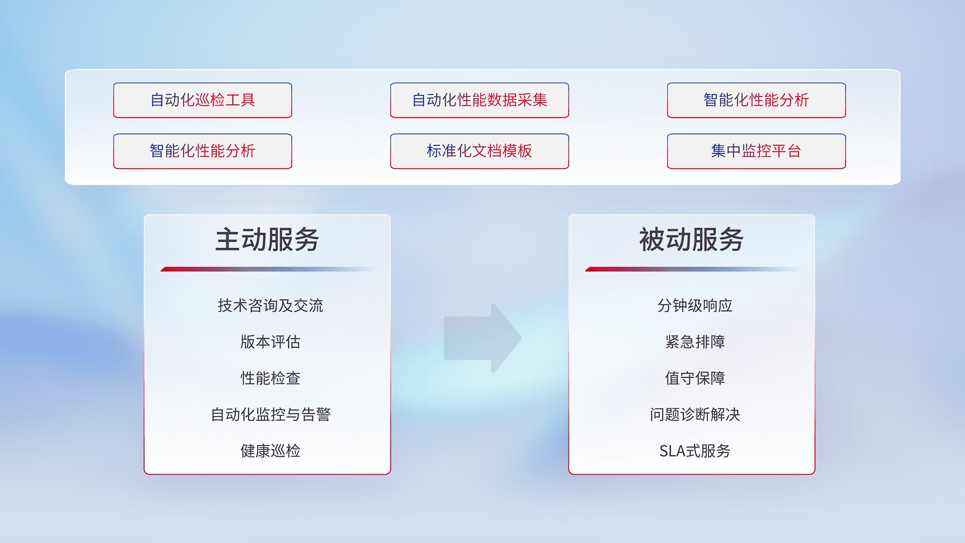 智能化工具和标准化文档,,保障服务质量,,,提供主动服务(包含技术咨询、、、版本评估、、性能检查、、、、自动化监控与告警、、健康巡检)和被动服务包含(分钟级响应、、、紧急排障、、、、值守保障、、、问题诊断解决、、、、SLA服务)。。。